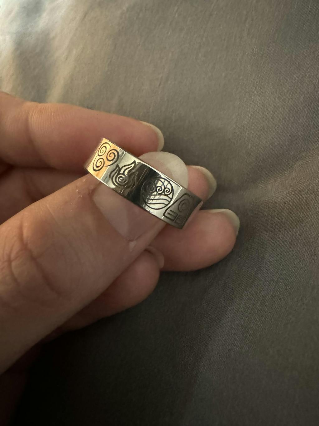 This ring is exactly what I wanted and came exactly as pictured. I got the silver version and I’m already itching to get the black one. I have been looking for a good ATLA ring and this was the first that fit what I wanted and is great quality. It fits good, it’s shiny, and the element symbols are clear and precise. I would definitely recommend this ring for sure. Thank you!